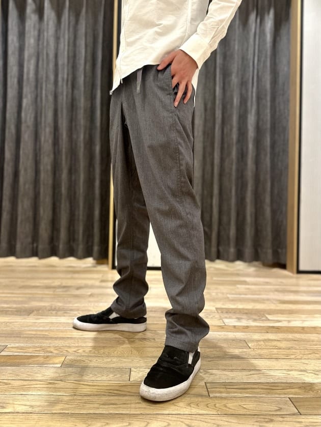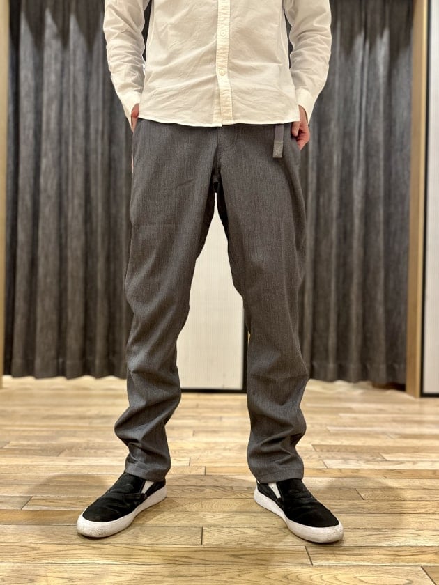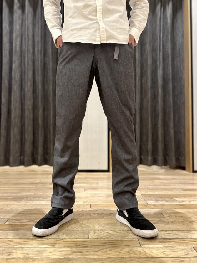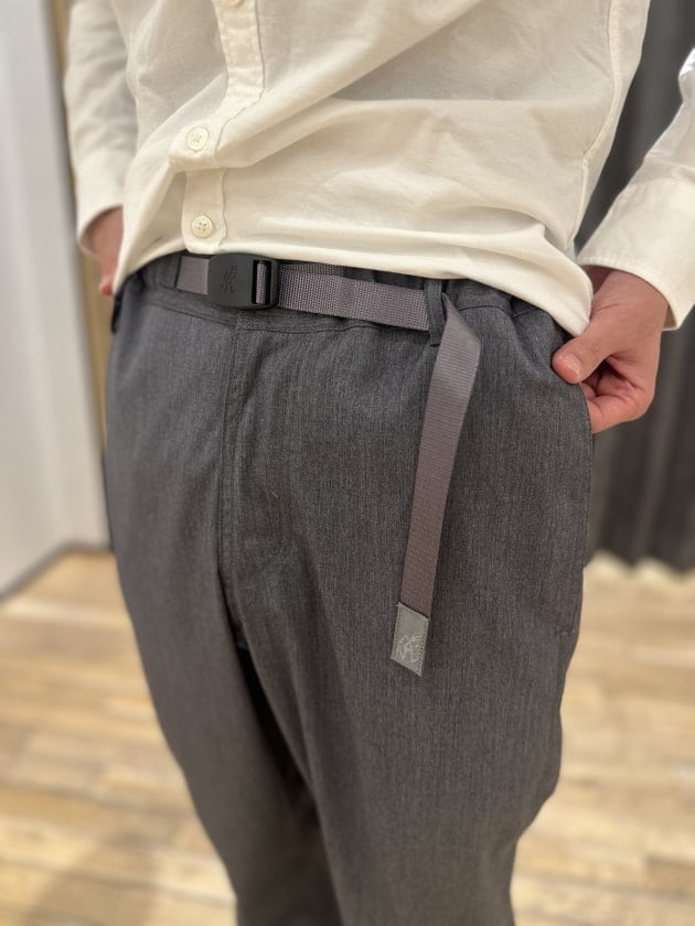上品なスラックスのようなデザインでありながら、ベルトレスで着脱可能なウェビングベルト、足の可動域を広げるガゼットクロッチなど〈GRAMICCI〉ならではの快適な機能性も備えた1本。