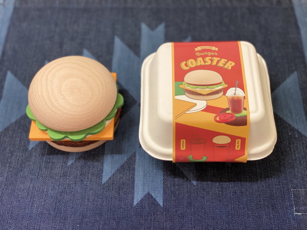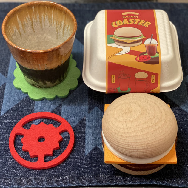 パテ、チーズ、オニオン、レタス、トマトの具材がウールフェルトのコースターになってます。
