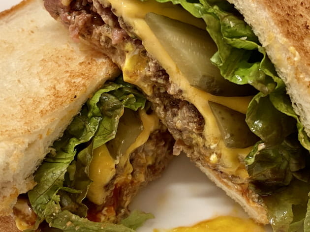 パテ、サニーレタス、チェダーチーズ、ピクルス、マスタード、ケチャップ でシンプルに。