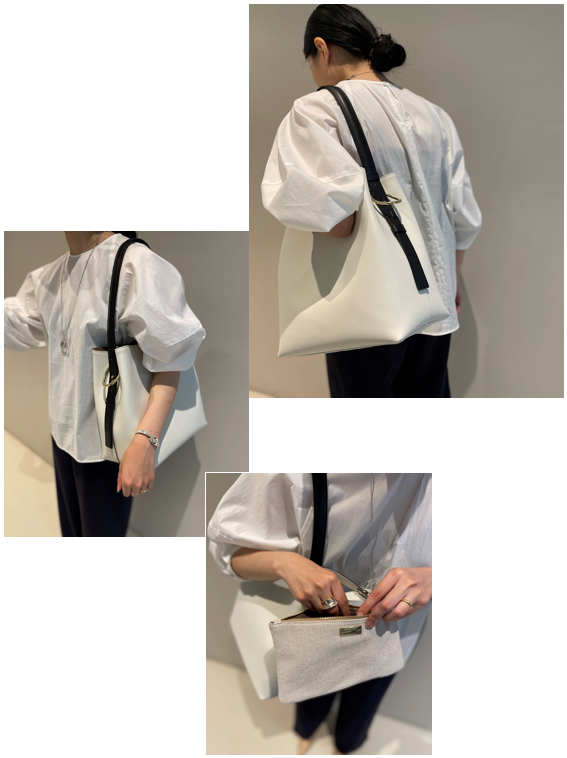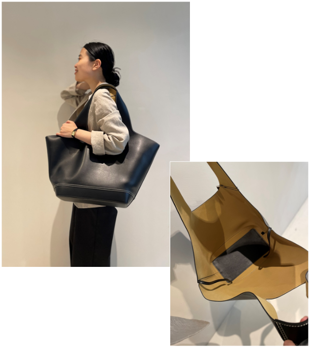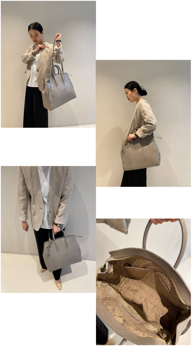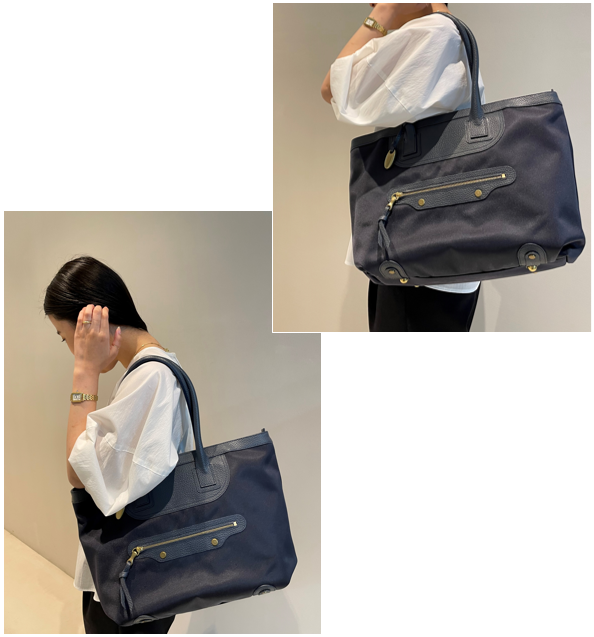 素材ならではの軽さと肩にかかるハンドルがポイント。何度も追加オーダーをしている人気モデルです。お仕事にも普段にも使いたいという方におすすめ!