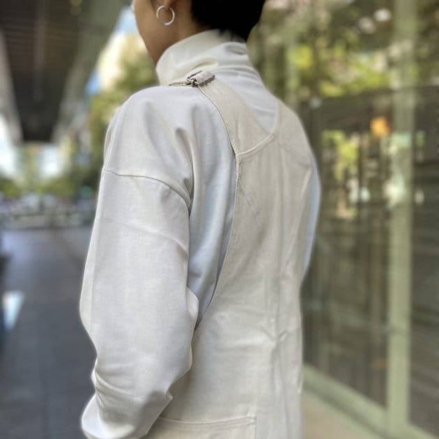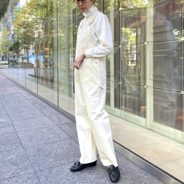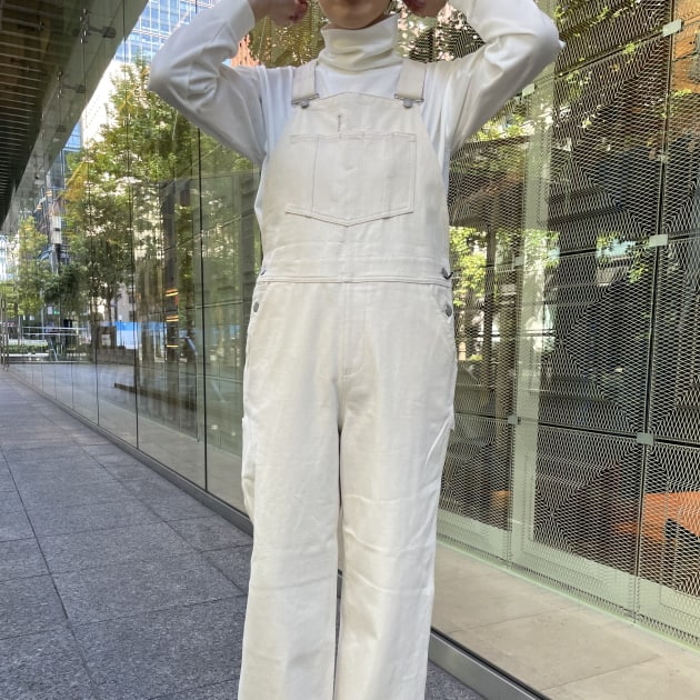 ゆるっとしたカットソーに対して、スッキリとしたデニムのオーバーオールを合わせた好バランス。謎の両腕バンザイスタイルでおすすめのネックラインもご確認下さい‥