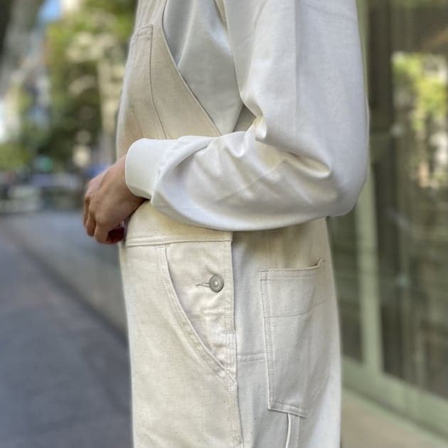 こちらのデニムのオーバーオール。手間隙かけて、低速で編まれた生地は、独特な膨らみのある風合いが特徴的。もちろんデニムなので耐久性にも優れています。
