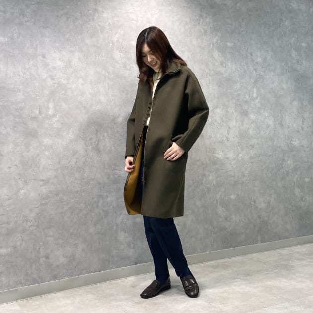 “綺麗めカジュアル”なコート。生地感はハリがあるので曲線が綺麗に出て洗練された印象です。着脱時も気分の上がるマスタードイエローの裏地も可愛いです。