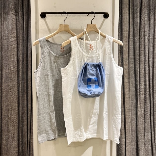 タンクトップと一言で言っても様々な形がありますがビームス プラスで取り扱っているのはフィッティングが大きくなく、肩口もそこまで開いていないので、どちらかというと下着として重宝する形だと思います。