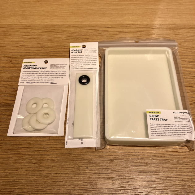 こちらはアメリカの<DETAIL INC,(ディティールインク)>という会社が出している蓄光素材のリングとタブと小型のトレーです。
