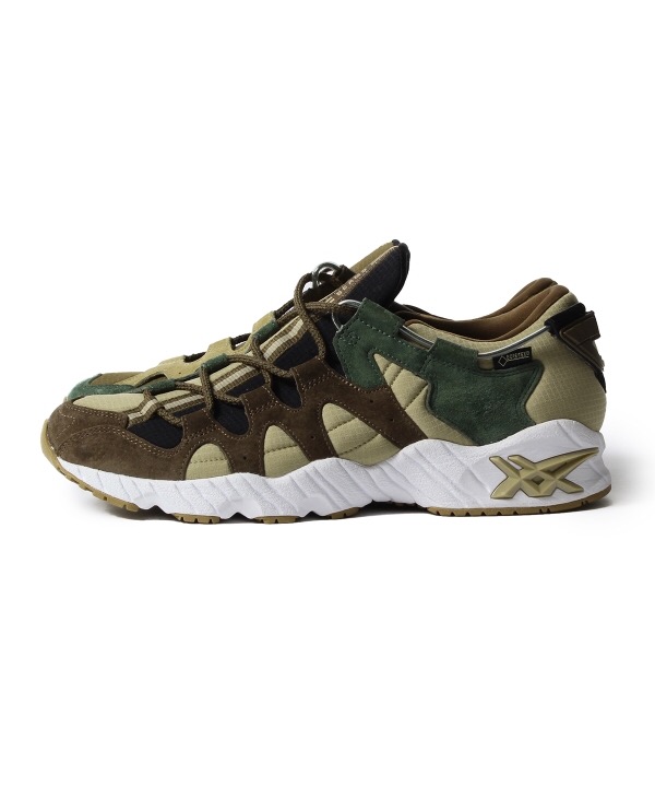 このASICSのGEL-MAIというモデル(1990年代に発売されたランニングシューズ)アシンメトリーのデザインを生かしそれを、あのミリタリー柄で有名なウッドランドベースの色見でカモフラージュ柄を表現しているので、シンプルなコーディネートでも雰囲気抜群なのは間違い無し。