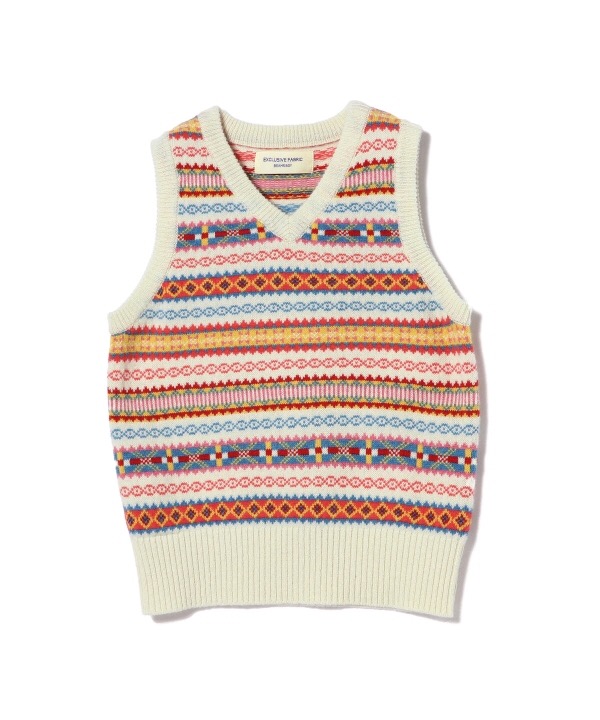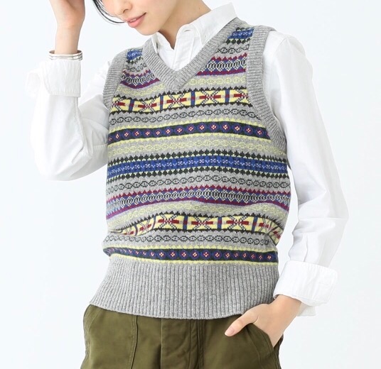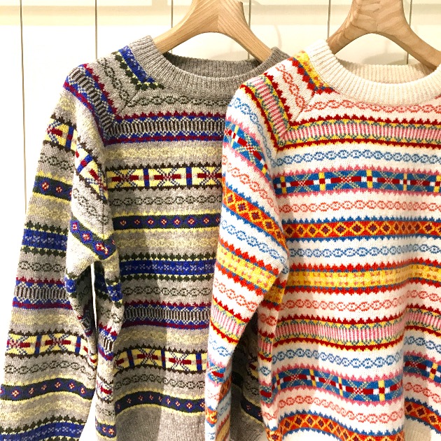 <BEAMS BOY>オリジナルのフェアアイル柄は、トラディショナルな雰囲気ながらもトレンドを感じさせるピンクと落ち着いた印象で柄を楽しんで頂けるグレーの2色でご用意。