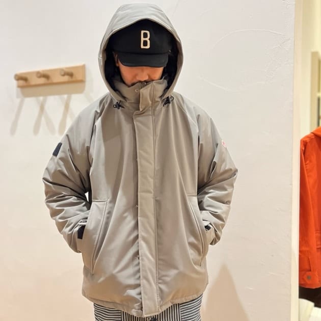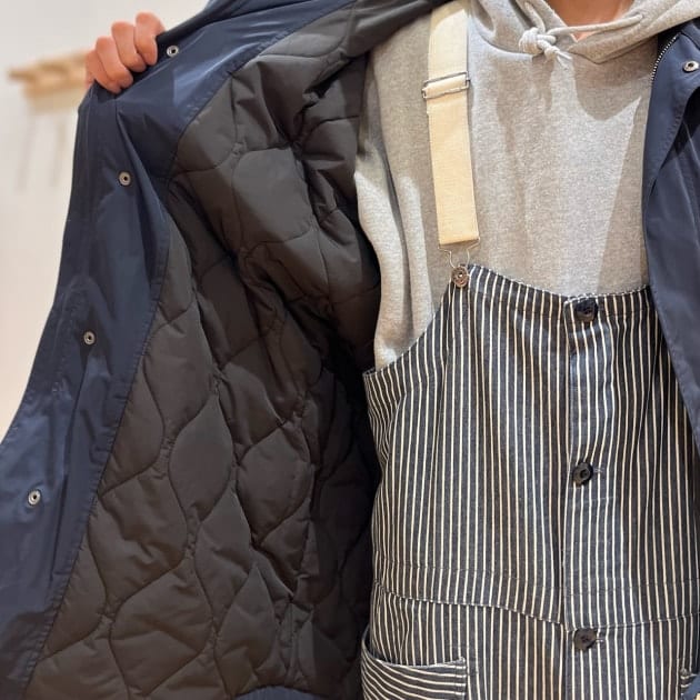 どこかヴィンテージ感のある素材が魅力的ですが細かい所はトレンド使用に。フロント部分にスナップボタンとファスナーを配置し、袖も絞られていて防風性をアップしております!
