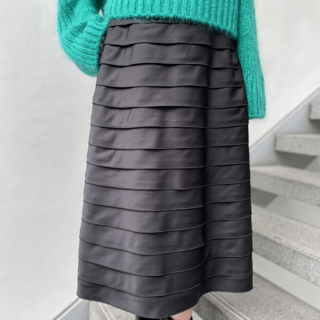 さぁ、最後はこちら。華やかなティアードデザインが目を引くスカート。すっきりとした腰回りでトップスのアレンジでドレスアップも叶います