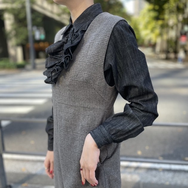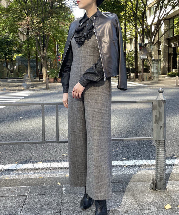 先ずはこちら、シーズンムード高まる柔らかな表情のグレンチェックのオールインワン。ウエストが高めの切り替えでスタイルアップが叶います