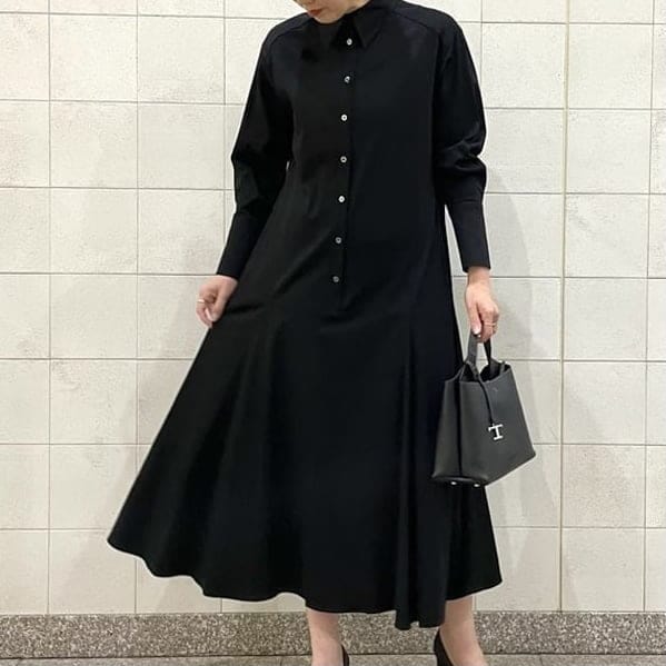 次は、清楚な印象のレギュラーカラーのシャツワンピース。しなやかな生地に揺れるマーメイドラインでひねりを加えた1着です。いつもやっちゃう、このポーズも健在です‥