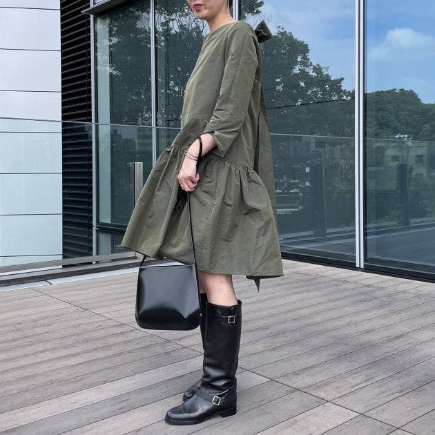 レディライクなワンピースをロングブーツで引き締めた旬顔コーディネートに↓