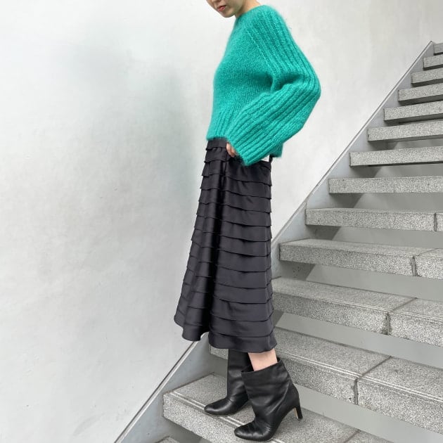 ボリュームスリーブのニットと合わせたコントラストが楽しめるスタイリングに仕上げました↓