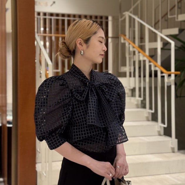 ボリュームのあるリボンを活かし、ボトムスはシンプルなテーパードパンツなどでスッキリまとめるのが好バランス。インナー付きなので、透け感を気にせず一枚でさらりと着こなせるのも嬉しいポイントです。