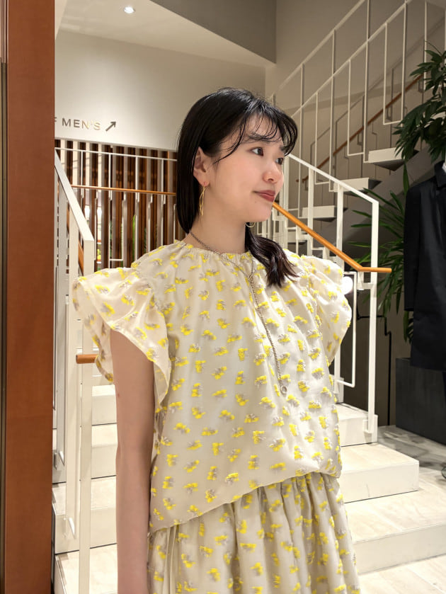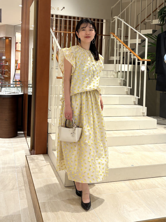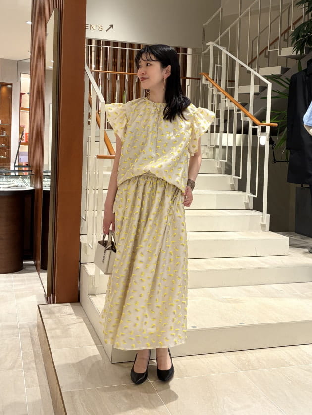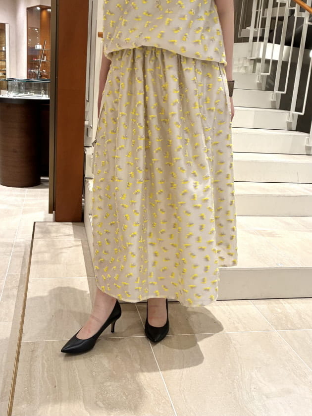 軽やかなジャガードがふわりと広がる同素材のスカート。