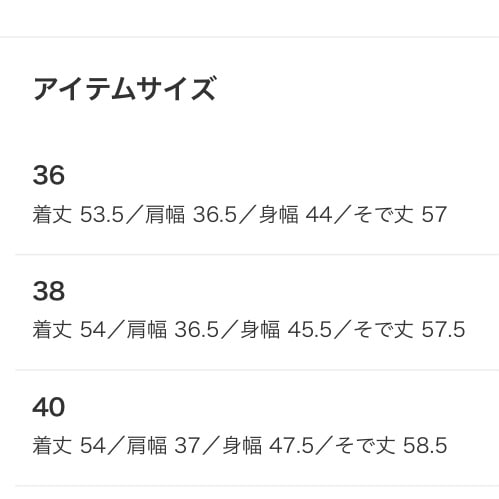 サイズガイドはこちら。着丈や肩幅はあまり変わらず、KOMAKIの体型でしたら40でも着用可能です。ちなみに一番変化のある身幅が40だと2cm大きくなりますね!