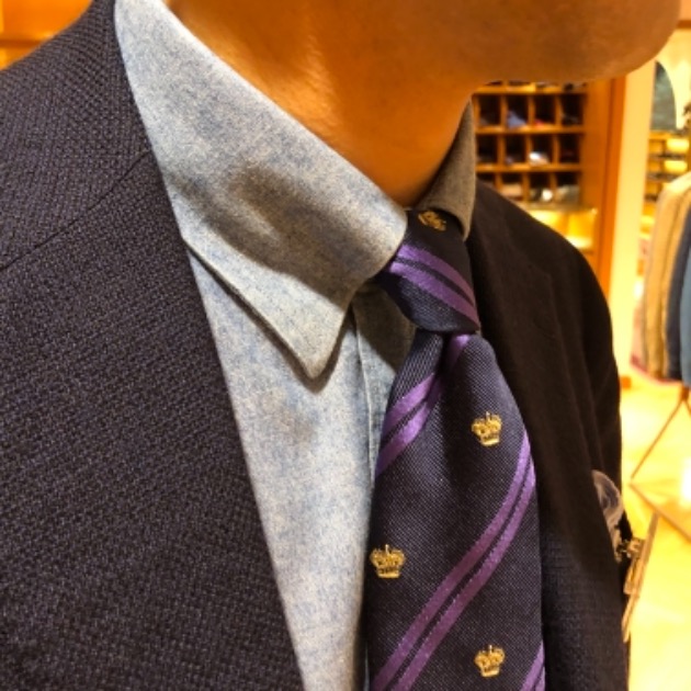 Vゾーンは、学生時代に買ったという<BEAMS F>のシャンブレータブと、<Brilla per il gusto>のクレストタイ。