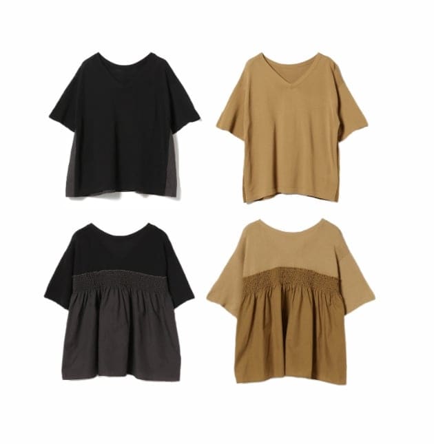首元は、Vネックとクルーネックで分かれており、前と後ろでキレイめやカジュアルなど様々なスタイルに合わせて着て頂けます。
