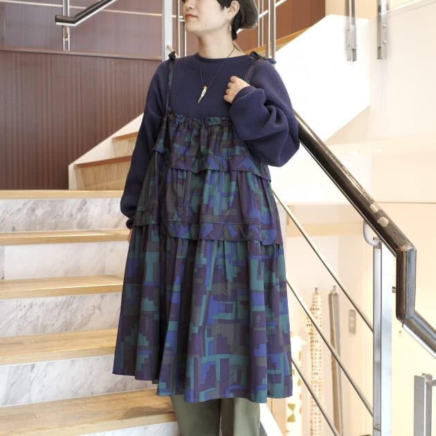 こちらのスカートはドローコードのテープ状の紐を結んで肩に掛けてキャミソールワンピースとしても着られます。
