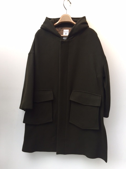 ウール素材のフーデッドコート。Aラインで、袖口にかけて広がりがありポンチョ風。ゆったりとしたフォルムでボリュームのあるインナーも着ることが出来そうです。