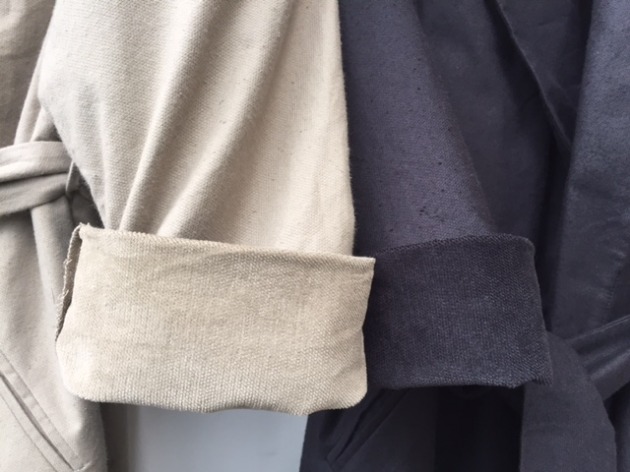 コットン素材のガウン風デザイン。上半身はドルマンスリーブでボリュームがありますが、ベルトを締めるとウェストから下は細身のラインになります。勿論ベルトを締めずに羽織る感じで着ても雰囲気があります。これも着丈は眺め。個人的な好みでお勧めです。