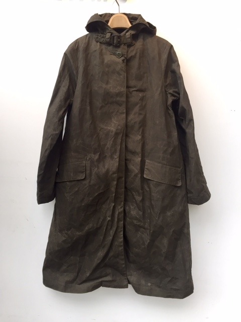 ワックスコーティングされたフーデッドコート。袖が細めですっきりしたライン。丈は長めです。