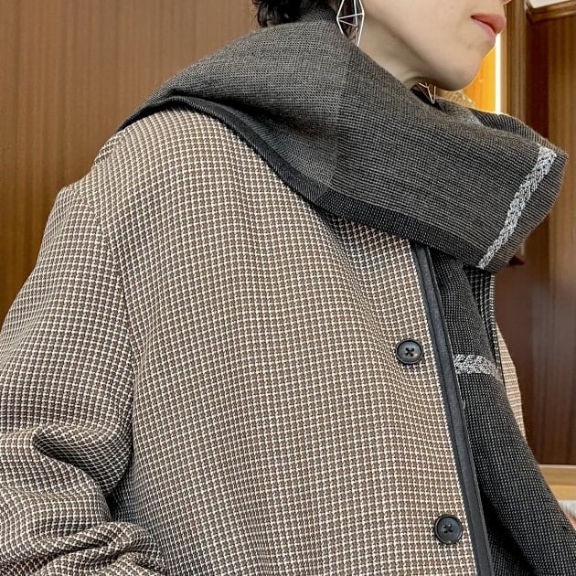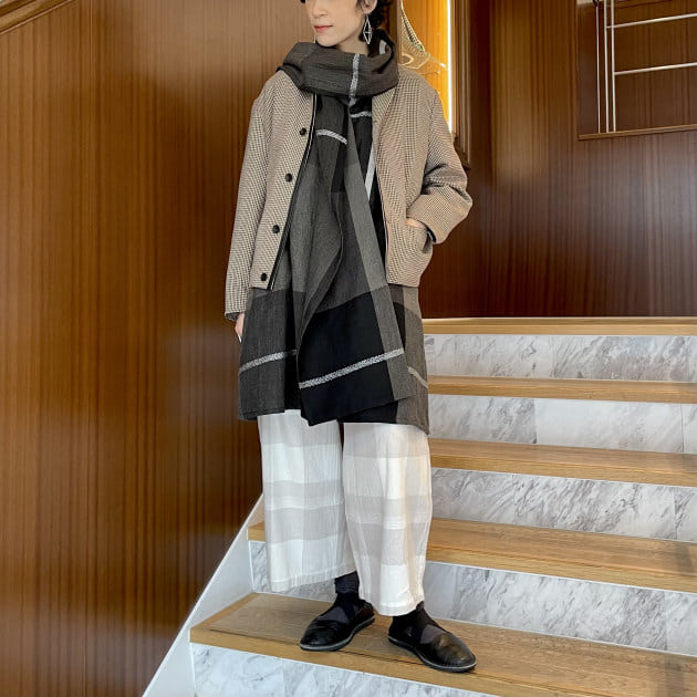 こちらはコットンフランネル素材にホワイト×ライトグレーの柔らかい色調のチェックが施されたセットアップ。素材的にパジャマに見えてしまうのでは、と懸念がありましたが、そこは<BLACK CRANE>、やはり綺麗なシルエットで上品な雰囲気に。