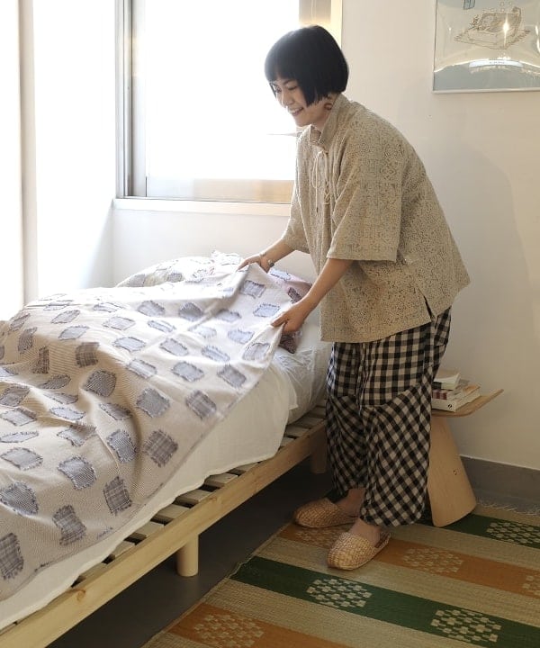 寝室をイメージした、<fennica>オリジナルのカバーや別注の花ござを使用したライフスタイリング。