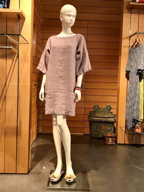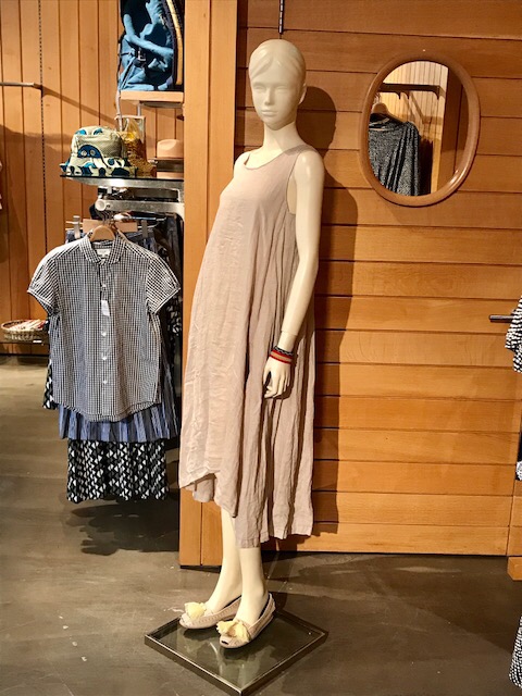 バックにたっぷり取ったギャザーと長めのヘムラインは、薄手のリネン素材の柔らかい質感を上手く生かしています。淡い色目は目にも涼しさを感じさせます。