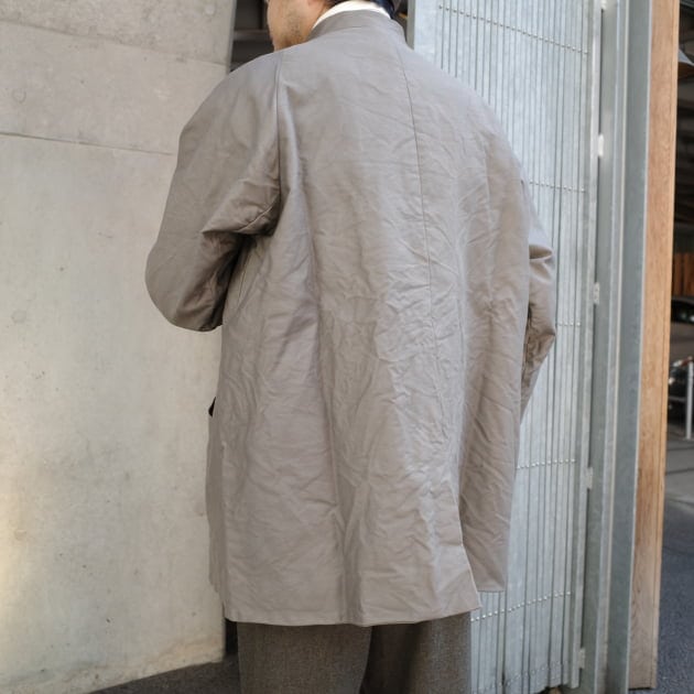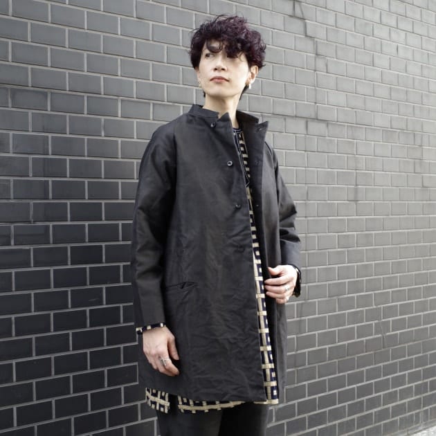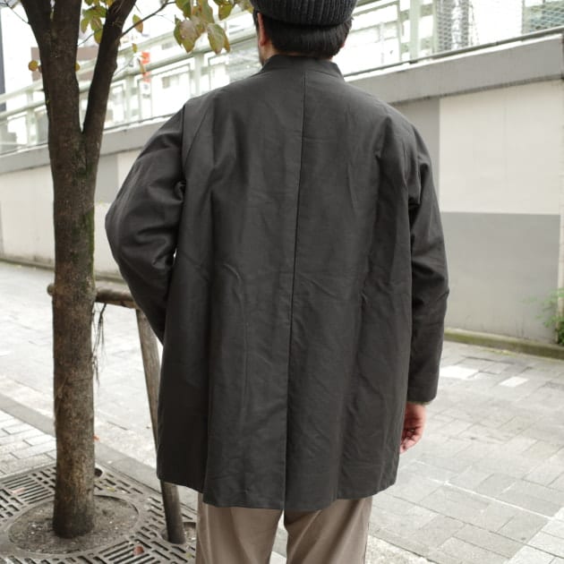 まずはこちらの“LIGHTNESS”。ラグランスリーブのノーカラーミドルコートです。