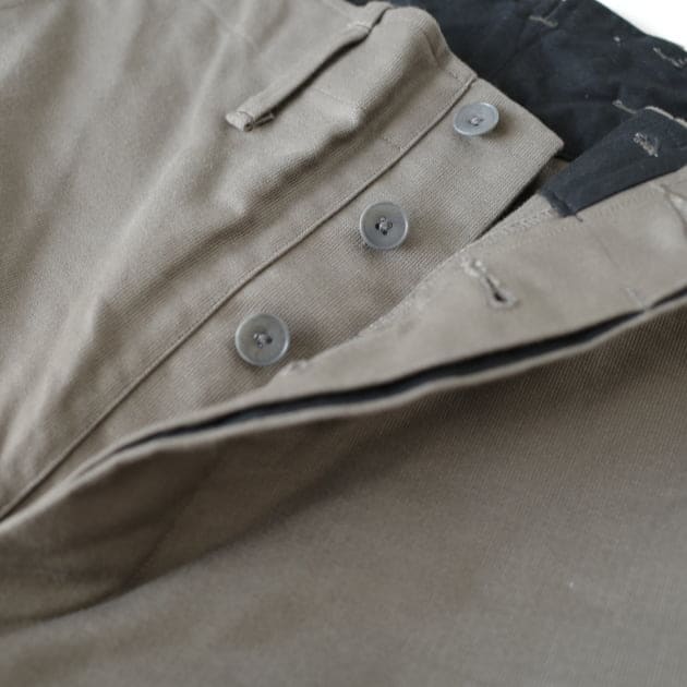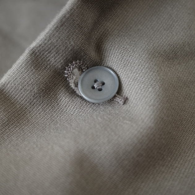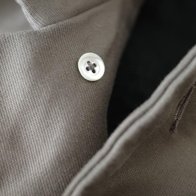 釦は現行のナットボタン、裏の力釦にはフランスの古いシェルボタンが使われています。少し力の抜けた表情がしっくりくるのだそう。
