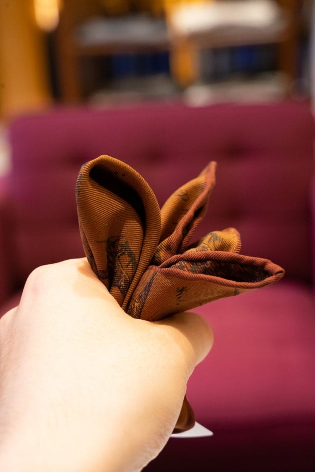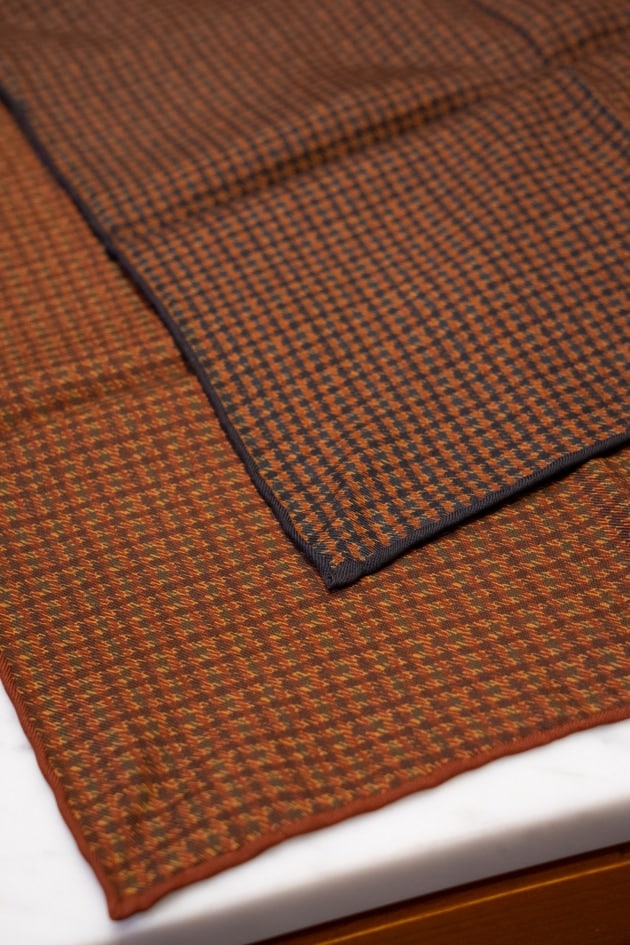 グリーンもオレンジも明るすぎず濃すぎず、前述のマットな質感でチーフが悪目立ちせず、コーディネートに華を持たせるというよりは全体の調整にひと役買ってくれる縁の下の力持ち的な活躍をしてくれそうです。