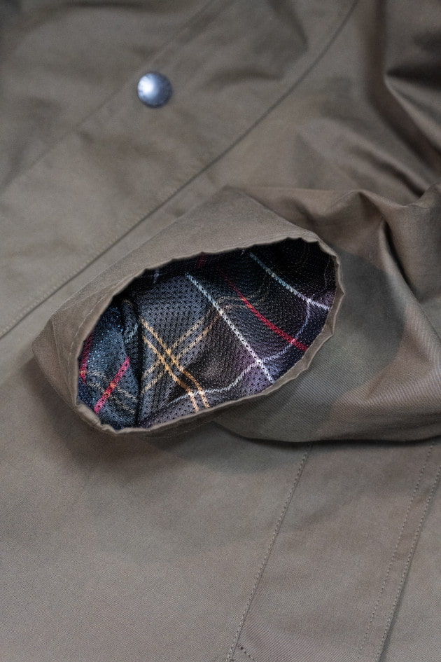 裏地にはチェック柄のメッシュを使用、脇下にはベンチレーション付き。