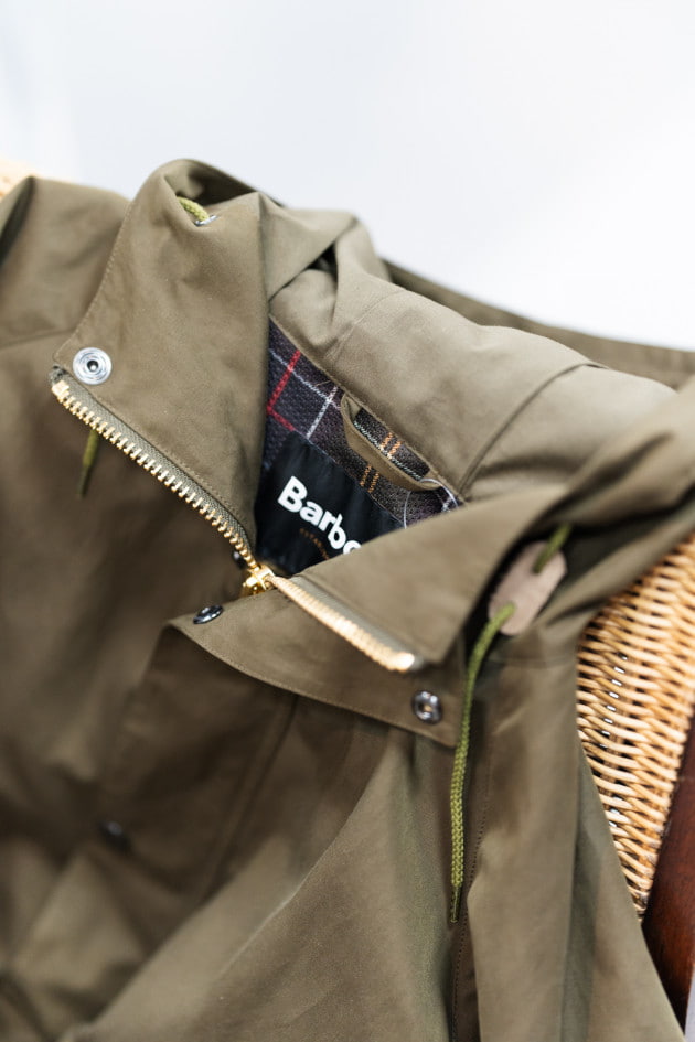 Barbour定番のHOODED HUNTINGをベースに、ジャケットの上からも着やすい様にボディのサイズにゆとりをもたせ、ノンワックスでありながら、馴染んできたオイルドコットンの風合いを再現したピーチスキン生地を載せたビームス別注モデル。