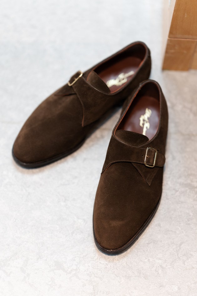 最近全体的に柔らかいトーンでまとめたい時に、ブラックスエードの靴があらためて便利だなと感じてきているのですが、<Baudoin & Lange>や<CROWN>ではちょっと軽すぎる場面があり、ちょうど良い靴を探していました。