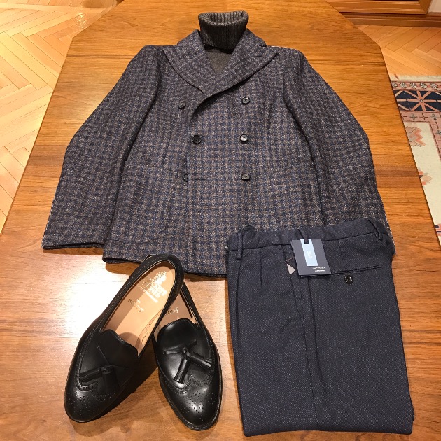 パンツはネイビーのコットンパンツを合わせ、アズーロ・エ・マローネのコーディネートを組みました。