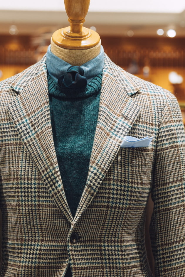 載せたのは英国の老舗〈MALLALIEUS〉のツイーディなグレンチェック。淡い生成りベースにブラウンとターコイズのコンビネーション。素朴でいて都会的な、洗練された柄出しです。