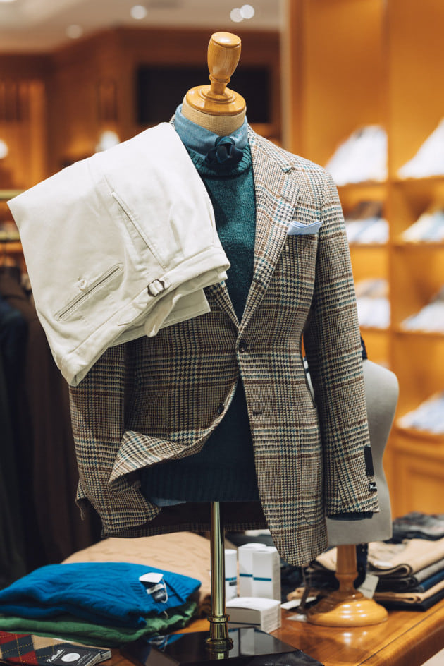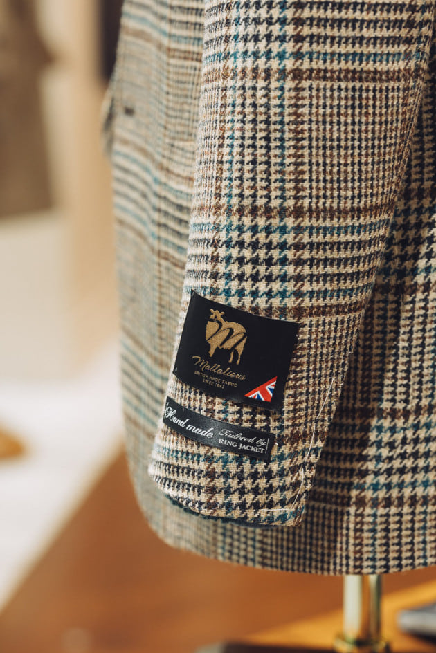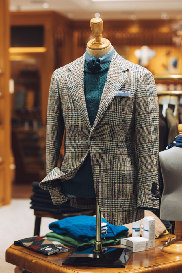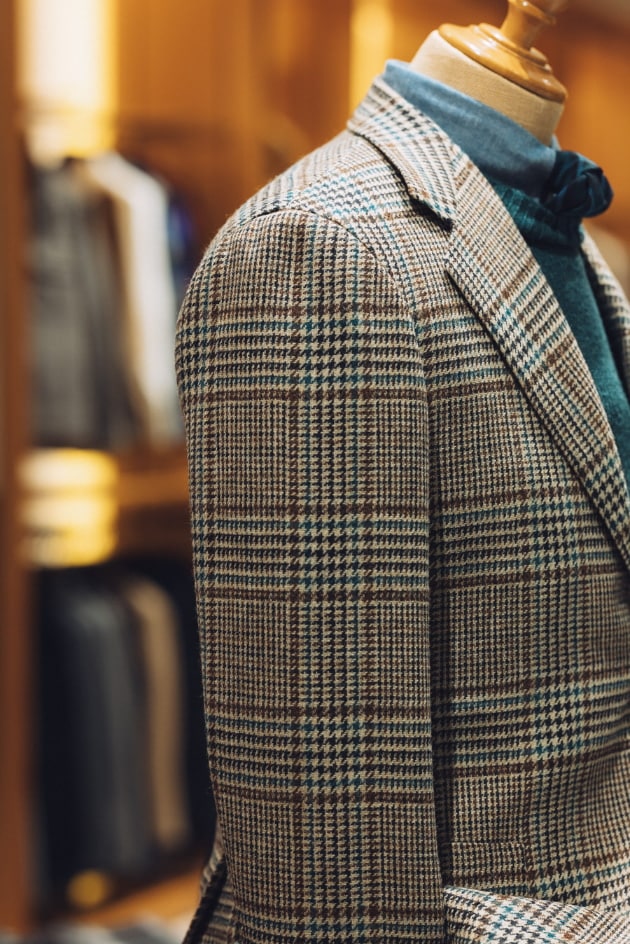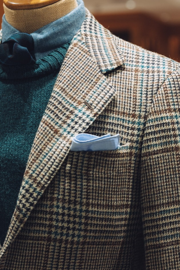 載せたのは英国の老舗〈MALLALIEUS〉のツイーディなグレンチェック。淡い生成りベースにブラウンとターコイズのコンビネーション。素朴でいて都会的な、洗練された柄出しです。