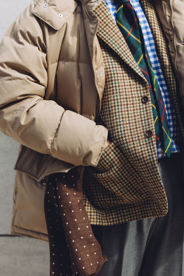 ニットやスウェット等、カジュアルな着こなしにはまず間違いないダウンジャケット。敢えてタイドアップに合わせることで、よりいっそうのこなれ感を纏えます。スタッフ高橋らしい、スポーティなパターンのレイヤードのジャケットスタイルにオン。ベージュのチョイスも品良く洒落ていますね。