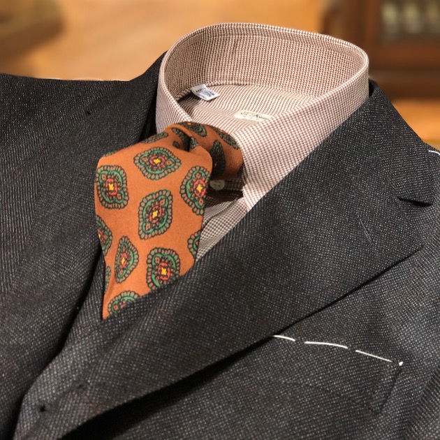 ヴィンテージの雰囲気を感じるスーツですので、タブカラーシャツにプリントのタイがオススメです。