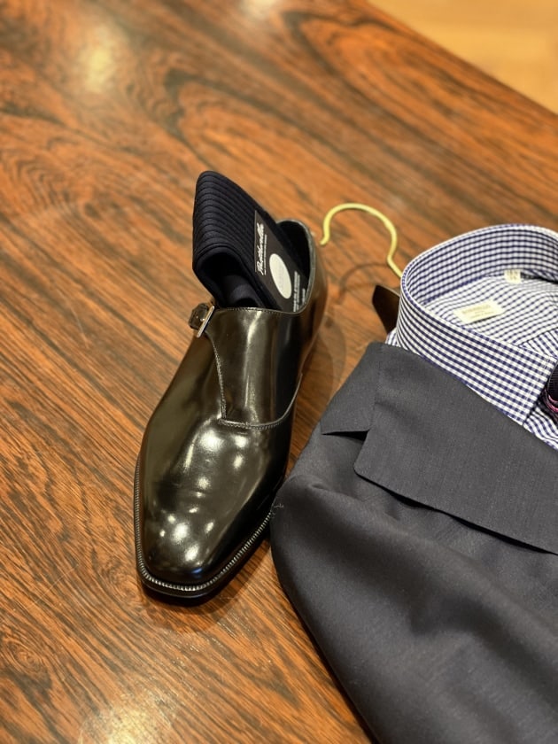 足下はエレガントなシングルモンクストラップシューズで。