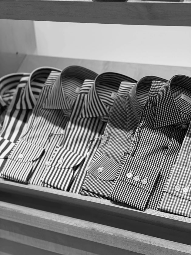 ギンガムチェックのセミワイドカラーシャツを用いたコーディネートサンプルのご紹介です。