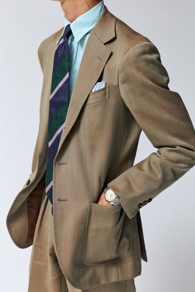 グリーンとネイビーのコンビネーションに淡いパープルのストライプタイと淡いピーコックグリーンのレギュラーカラーシャツのVゾーンに、ソラーロのスーツを合わせスポーティにまとめたスーツスタイル。洗いのかかったシャツの素材感とタッチがほんのりとラフなムードをプラスしています。微妙にずらしたチーフの色合いも奥行きが出ていますね。