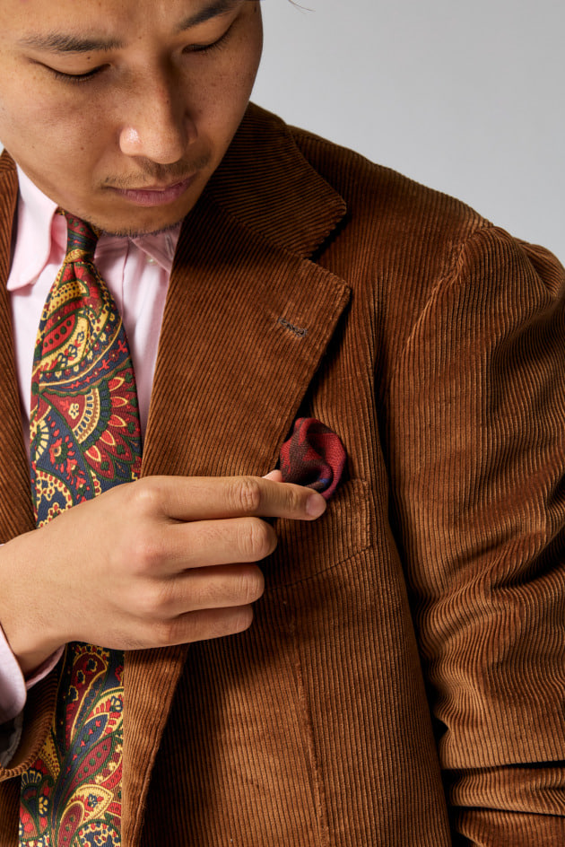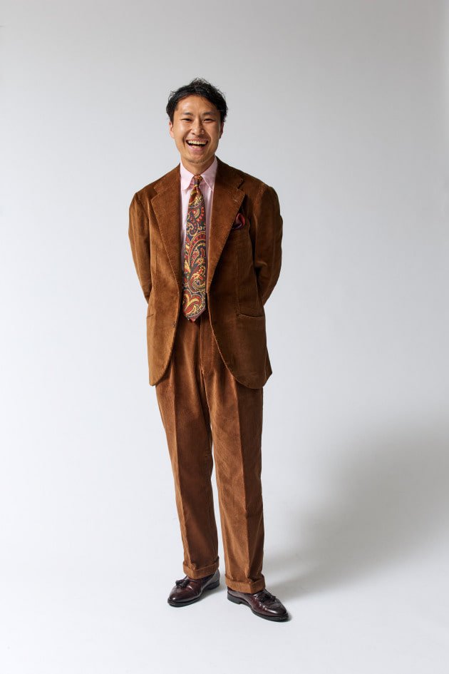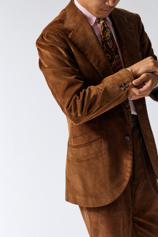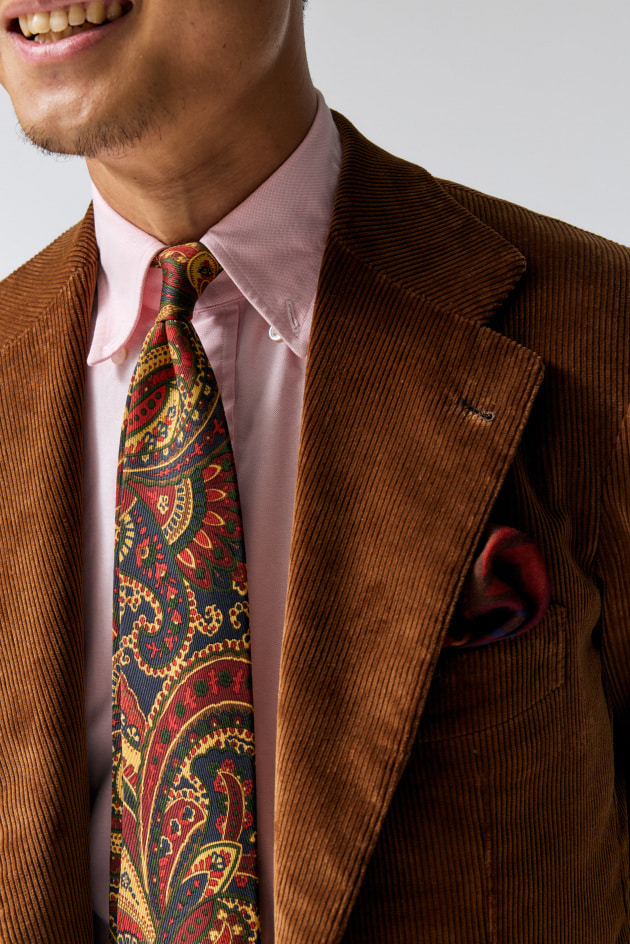所謂”金茶”と呼ばれるブラウンコーデュロイのスーツとプリントのペイズリータイのカントリームードなコンビネーション。ピンクのシャツと足もとのタッセルローファーでほんのりとアメリカンなムードに振っていて、ブリティッシュアメリカンなクラシックさを演出しています。力強いラペルに柔らかな肩まわり、ハーフムーンのポケットと、ディテールでモダンな遊び心もたっぷり。若い感性でクラシックを表現した、現代的な空気感がポイントです。