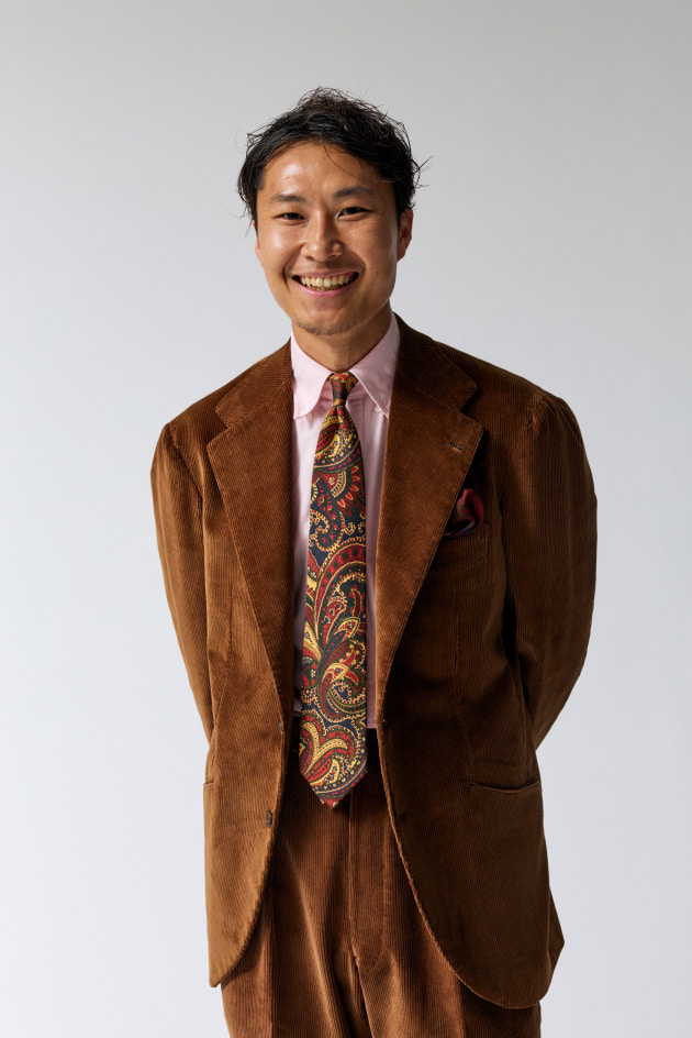 所謂”金茶”と呼ばれるブラウンコーデュロイのスーツとプリントのペイズリータイのカントリームードなコンビネーション。ピンクのシャツと足もとのタッセルローファーでほんのりとアメリカンなムードに振っていて、ブリティッシュアメリカンなクラシックさを演出しています。力強いラペルに柔らかな肩まわり、ハーフムーンのポケットと、ディテールでモダンな遊び心もたっぷり。若い感性でクラシックを表現した、現代的な空気感がポイントです。