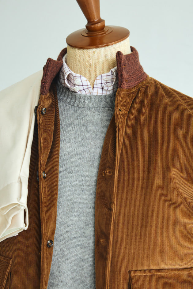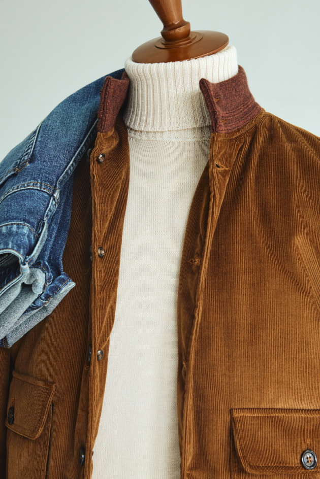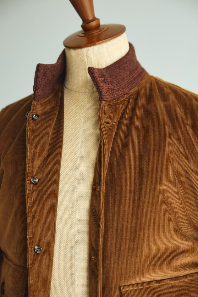 滑らかなコットンコーデュロイは、カントリー調の綺麗な金茶色の色出しがクラシックでかつ上品。着込むほどにそのクタッとした表情をさらに増していく、永く愛せる素材感です。