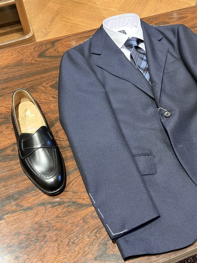 ネイビー無地、モヘアの生地をのせたスーツと少し真面目なスーツを今回チョイスしました。