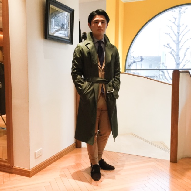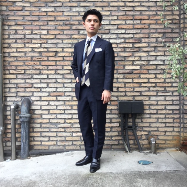 採寸を経て、仕上がったスーツを着用してきた時の一枚。