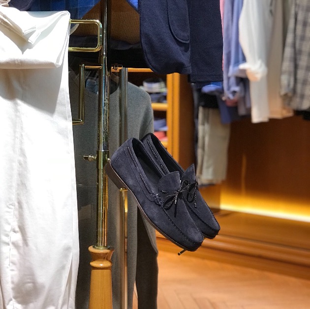 合わせるシューズはネイビースウェードのスリッポンで少しカジュアルな合わせをご提案。