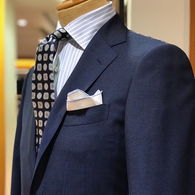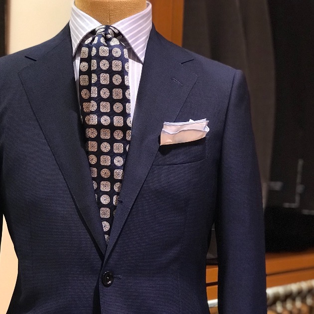 濃紺とまではいかず、青みを残したスーツは<BEAMS F>のオリジナル。逆抜きのストライプシャツに小紋柄のネクタイで。チーフは縁にほのかにブルーのコットンリネン素材です。
